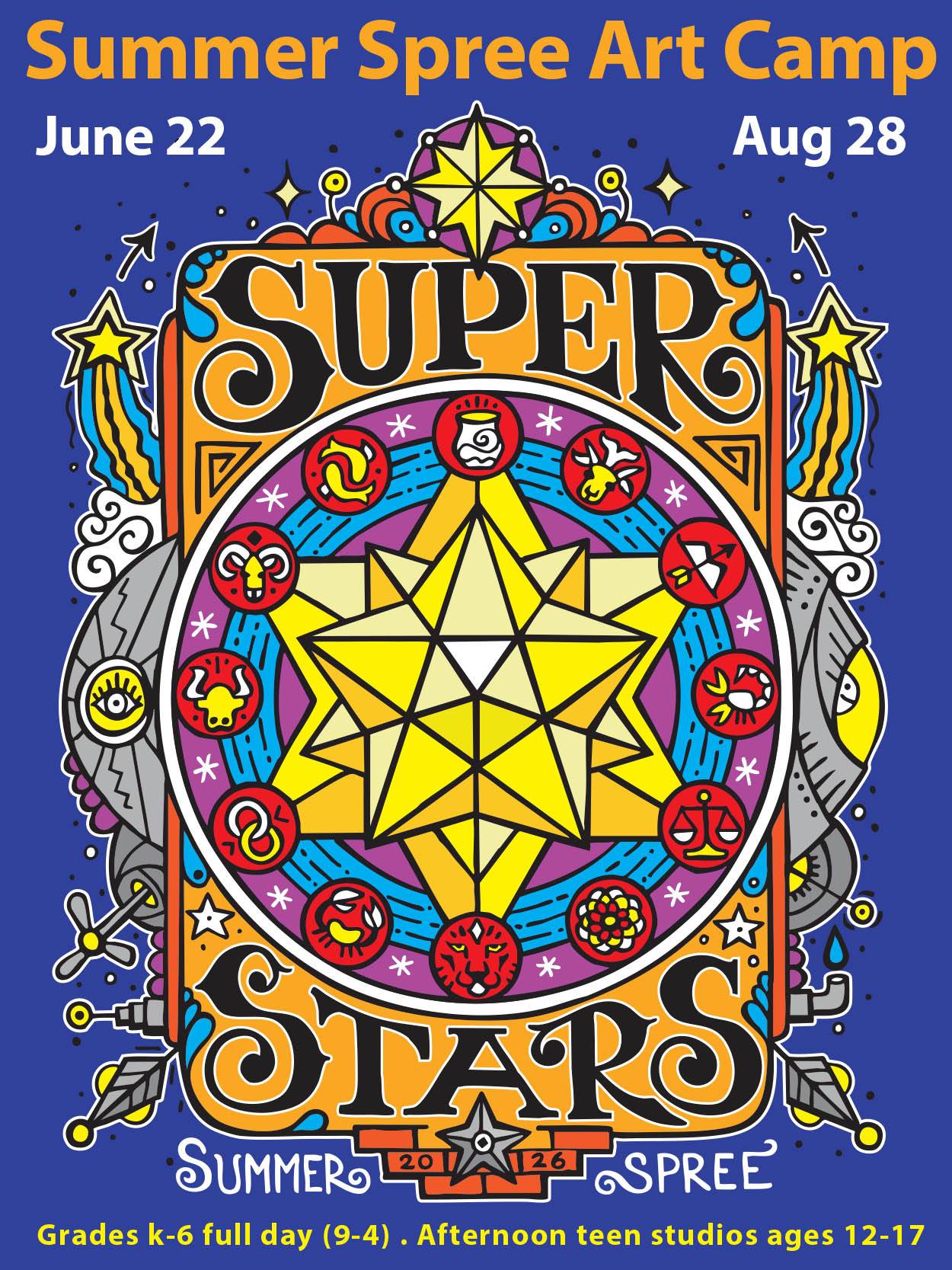 Camp runs 9am-4pm in week long sessions. CAC also offers afternoon Teen Studios featuring cartooning, photography, ceramics and more for students entering grades 7 through 12. Plus Rock & Roll camp! Our theme this year is SUPER STARS!